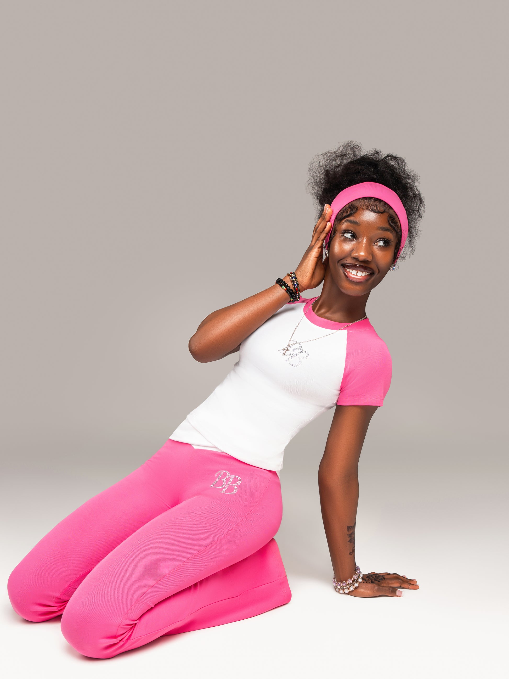 Featuring our signature BB rhinestone logo, this two-piece set includes a fitted short sleeve top and flattering flare pants.